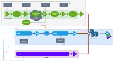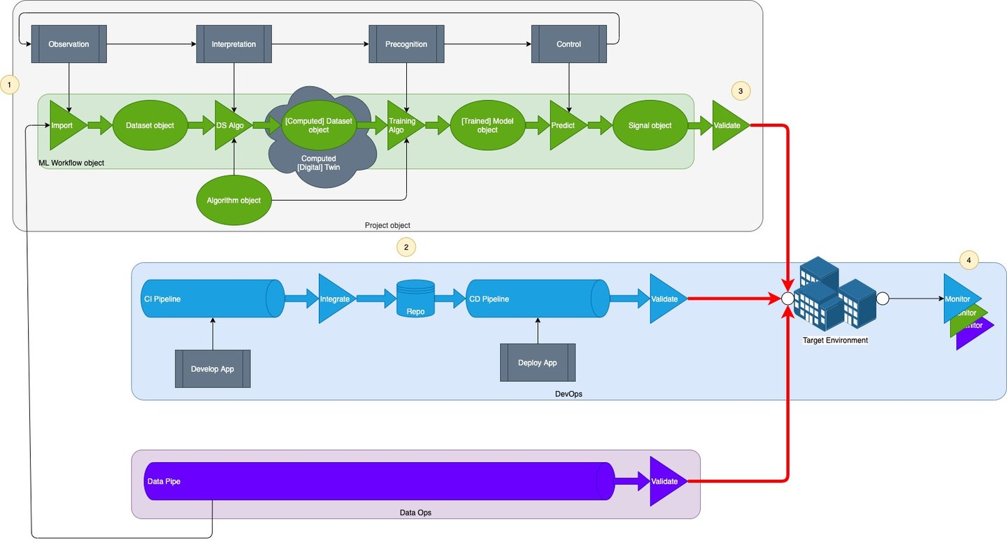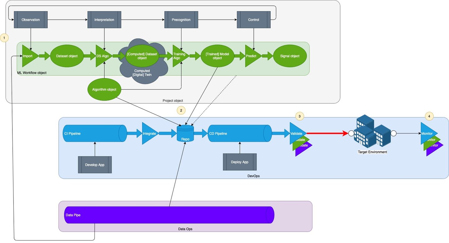 ML Ops - closely coupling model development and deployment with that of software applications and data pipelines; the capability to deploy and observe the right model + right data + right application, at the right time.