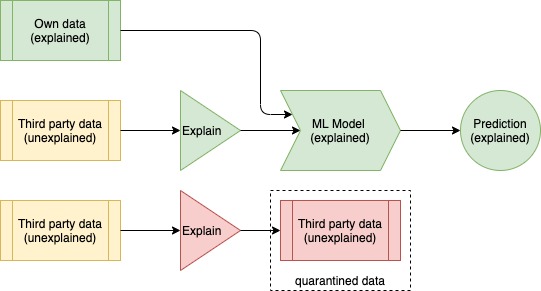 Rather like a chain of custody, if every dataset and every model is explainable, then the resulting prediction is also explainable. The explainability of datasets and models can be computed and shared by the third parties providing them. Alternatively, they can be computed by the system ingesting them. If the metrics are acceptable, they can be used to train the model. If unacceptable, they can be quarantined (used with caution) or rejected.